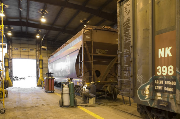 修理中のBNSFのホッパ. モデル同様ステップはよく壊れる部位だ.